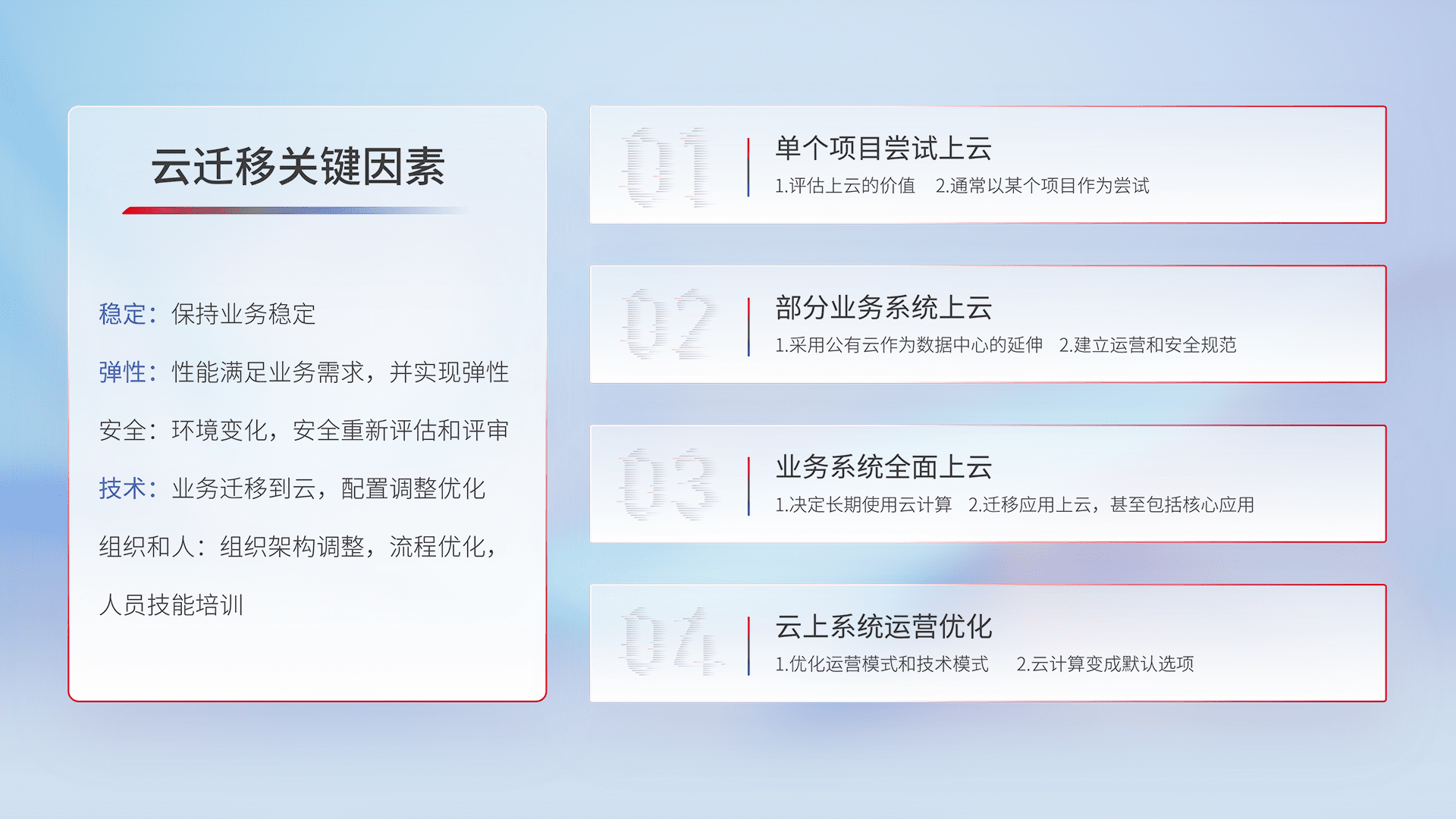 结合实际业务,,,,从规划设计、、、云平台选型、、、、云原生改造、、数据迁移、、集成交付,,迁移全过程为客户识别最佳上云路径,,做好风险识别管理,,设计网络架构、、、、身份权限、、、、安全审计合规、、、操作审计、、、、日志审计、、监控告警策略、、、、多站点容灾设计等,,对云上基础设施进行整体规划,,,提升IT治理水平,,,以满足弹性、、高可用、、、高性能的需求。。